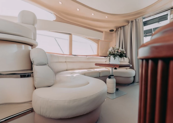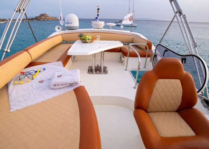 Azimut yacht based in Mykonos is ideal for a private day rental in Mykonos up to 12 guests for day charter with a comfort flybridge outdoor area